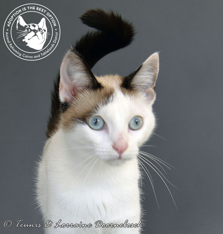 This pair of chatty tri-coloured sisters are beautiful! With their stunning turquoise blue eyes and confident, friendly natures you can’t miss these girls when you’re in their company. Tina is a total lap-cat, she’d love nothing more than to have full possession of your lap, chest, back(if you happen to bend over) and just about any part of you she can make herself comfortable on. Turna is (slightly) more dignified – mainly because Tina’s there first – and will (mostly) wait more politely for an invitation for cuddles. Gentle in play and hugely affectionate, Tina & Turna are just waiting to make your home their castle. These gorgeous girls just love each other’s company and are looking for their forever home as a bonded-pair.