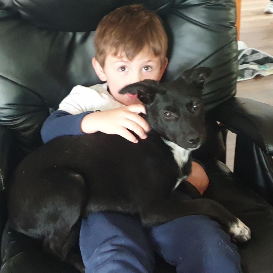 Despite that she has not had the best start in life Jersey is eager and willing to learn.Her photo is taken with her current "carer" Max (grandson - not up for adoption :)) She has been sleeping with Max and adores him!