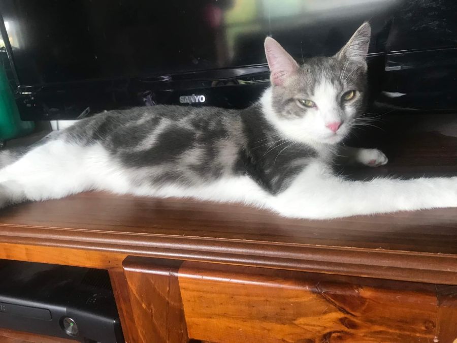 Dusty is great with other cats, he loves smooching your legs and sleeping on your bed, he is ok being picked up and was raised with children.