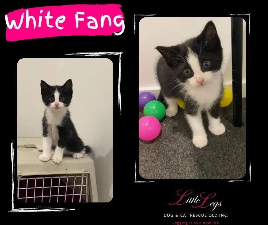 White fang is your typical black and white tuxedo. He is a simple creature, who loves adventure and cuddles. The loudest purr you will ever hear and loves to play. He is very social, loves everyone, and belly rubs.