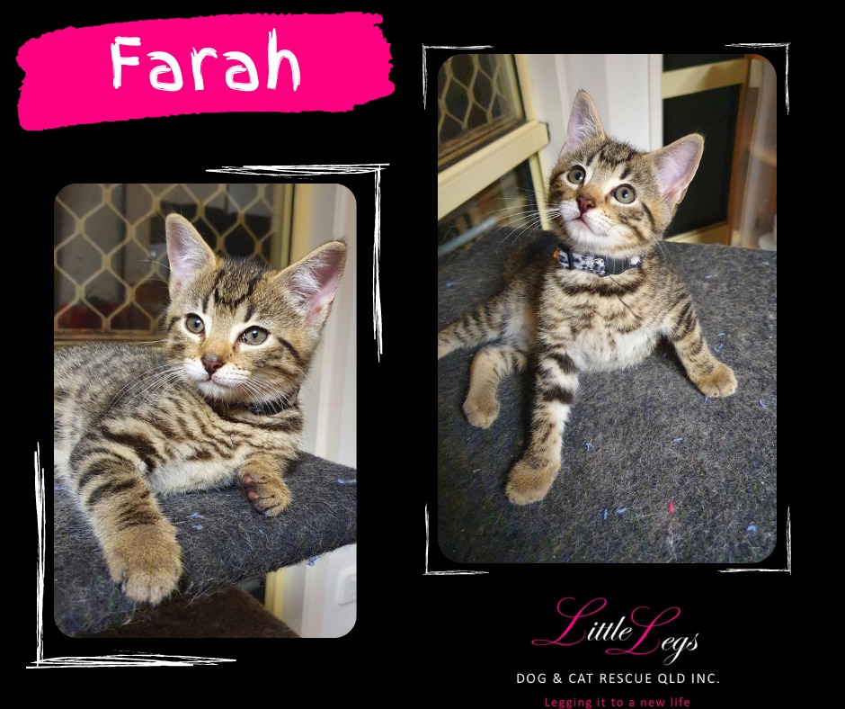 Hi! I'm Farah and I'm part of the Winx Saga litter of 5 Tiny Tigers 🙂 We were only 4 weeks old when we were caught by humans, dumped in a box and left at the pound. That was pretty scary I tell you! First our mum went missing and we had to fend for ourselves and then everything we knew was gone as well. No wonder we were all shaken up and scared when we arrived at our foster mum's home, huddled together in a big tabby coloured ball. Me, being the big sister that looked fter & out for my sisters & brothers by keeping them safe and fed after our mum went missing, tried to scare our new foster mum by growling and hissing at her when she touched us but she didn't fall for that and step by step she showed us we didn't have to be scared of her at all. And now.. 4 weeks later we cannot wait to receive our kisses & cuddles! The moment our door opens we run to her, flop on our backs for rubs and cuddles and 6 cylinder engines running! Oh man, life's so good now but will be so much better when you take me home and luuuv'me furrreverr. I'm playful, curious, affectionate, darn pretty (according to mum) and I'll be your cuddle buddy once I get to know you. I have excellent toilet manners and eat anything you give me, I'm far from picky LOL I'm the biggest of our litter. I'm a little more independent than my siblings but aying that, I still love company. Just one very important thing... please don't let me be all by myself all day, I would feel very lonely. We are very social animals and thrive when having a buddy to play, sleep and chat with. I have 4 brothers and sisters to pick from if you don't have a furry friend for me already... just saying ha ha ha What do you say, shall we meet? Mum lives just North of Brissie and meet & greet days and times are very flexible.