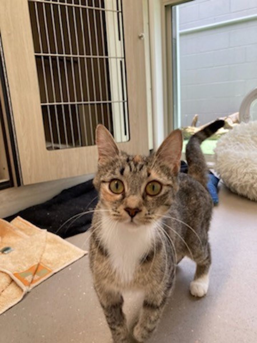 Kirsten was only 10mths young when she had a litter of 4. She is a wonderful teenager mum who has adapted well, looking after her babies. Kirsten is always up for a cuddle and a pat and being so young, she should adapt quickly into her new furrever home. Kirsten is a tabby with striking spots of ginger in her fur.