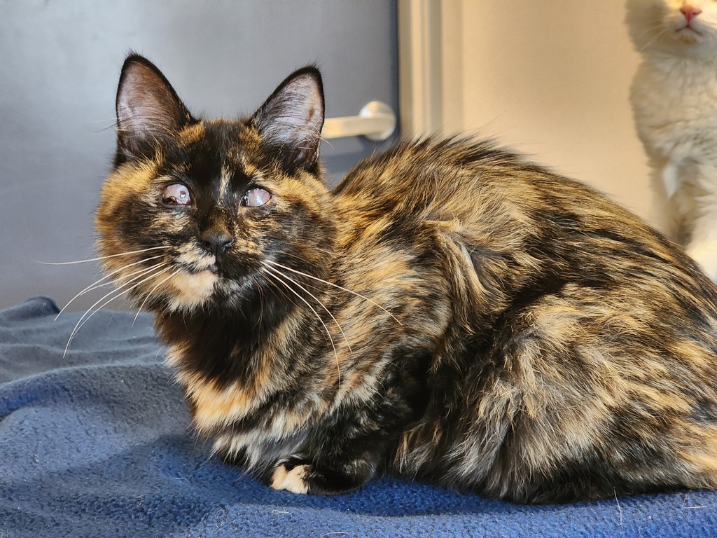 Broccolini will need a home that is determined to keep her as an inside only kitty and a family that is happy to also adopt her best friend and sibling Cauliflower. There is the potential that the pair will need to seek medical assistance as they age and their eyes continue to develop but Broccolini has had corrective surgery and we would hope this is not the case.
