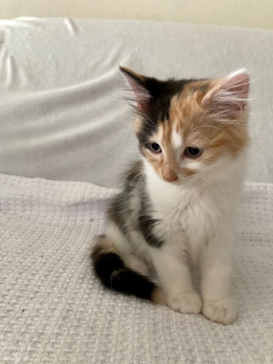 Mia is one of 4 beautiful kittens born under our care when heavily pregnant mum was rescued from the streets in September. Calico