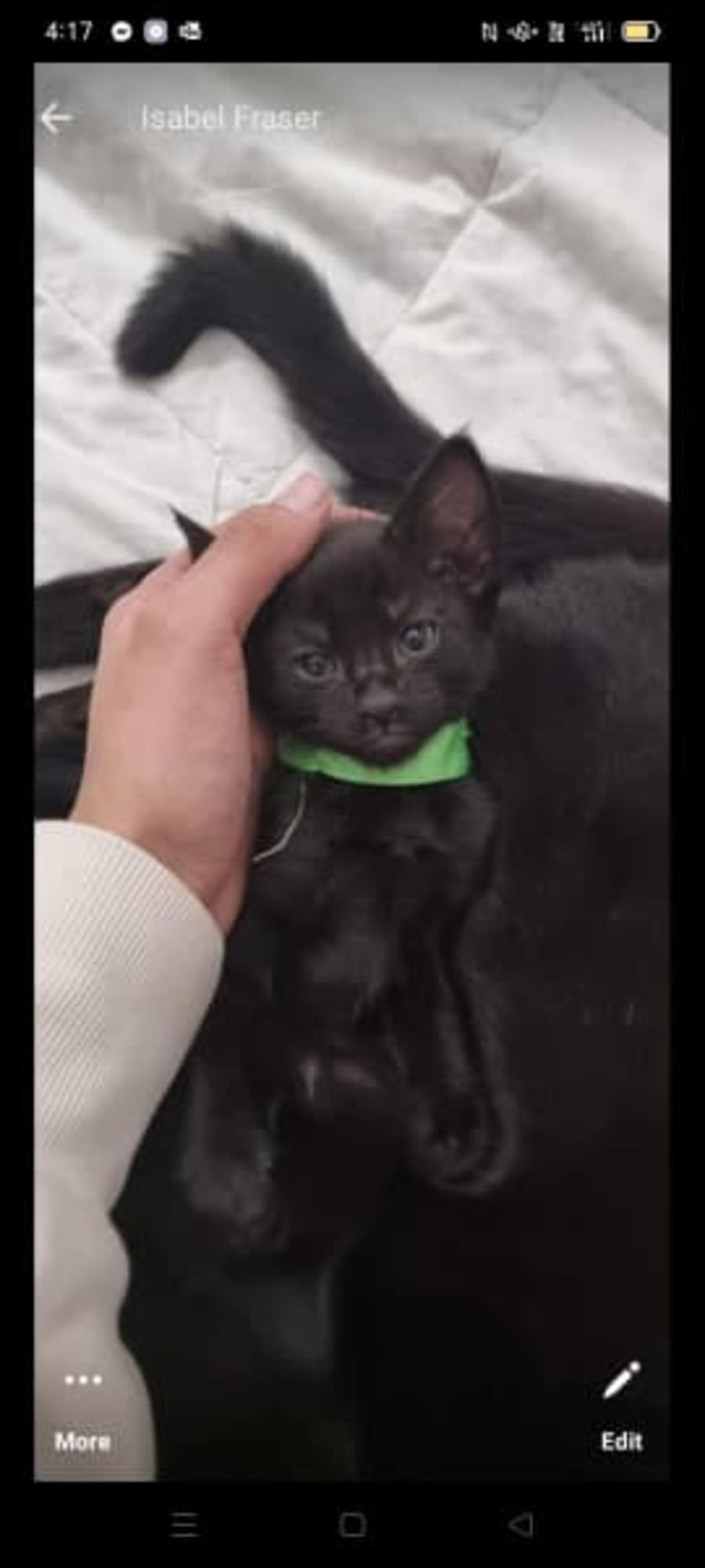 Hickory is a male black tabby. He is not shy and very curious and playful. Hickory will explore the house and wants to know what his humans are up to all the time. He loves to sleep on your bed at night and because he has been raised with his 3 other