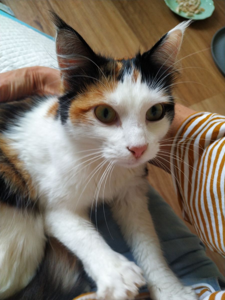 Gucci is a petite 8 month old, medium haired calico kitty, with the most magnificent foxy tail! She's a little nervous in new environments, but very friendly and trusting toward people. She will suit a home with humans who are home a lot, to provide her with all the cuddles she craves. Gucci would love another friendly kitty to also keep her company. She requires an indoor only home or with access to a cat run.