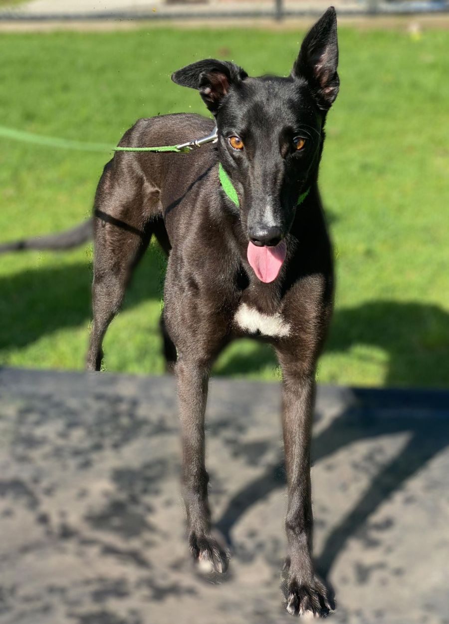 This girl is very sweet and very goofy. She loves to run and leap and do lots of zoomies, then in typical Greyhound fashion, will flop down for a nice, long nap.