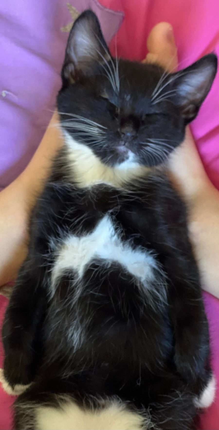 I love love LOVE !!! Belly rubs and will often fall asleep on my foster family with my “ hands in the air like you just don’t care!!” cuddles . I love to play with the cats and dogs in my foster family.