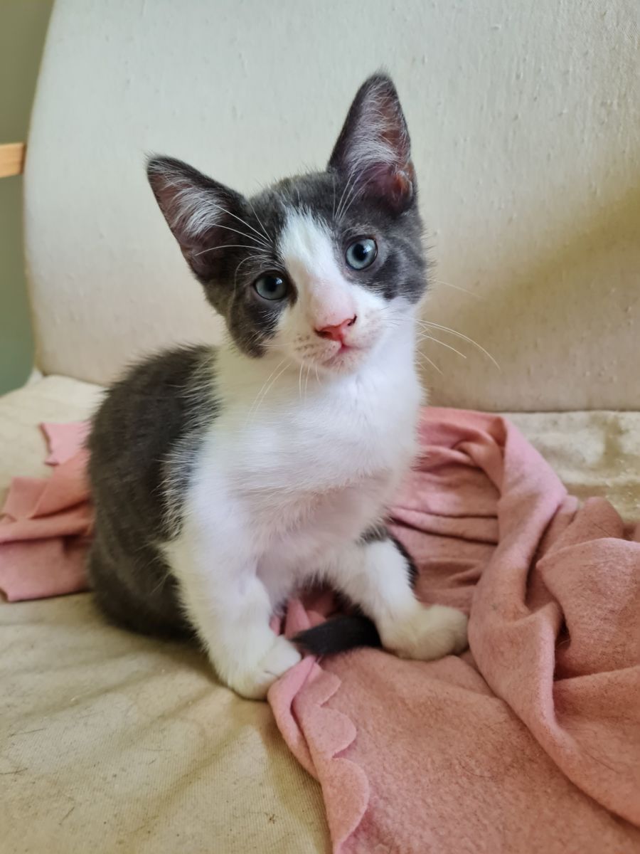 Pork Bun is a super friendly 3 months old kitten who was born in foster care with his 5 siblings. He has gorgeous grey and white colouring and lovely soft fur.