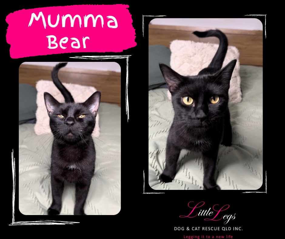 Mumma Bear is a beautiful black cat that anyone would stop to pat if she crossed your path (no superstitions here). After being found on the streets with her young litter, Mumma Bear has grown used to the home life. She loves to look out the window at the world passing by and snuggle with everyone that she meets. Her purr is louder than a tractor and her affection levels are off the charts. Mumma Bear will come in for pats no matter what activity you are doing around her. Belly rubs are ger favourite! Mumma Bear would suit a cat free home as she likes to be the only cat and does not play well with others.