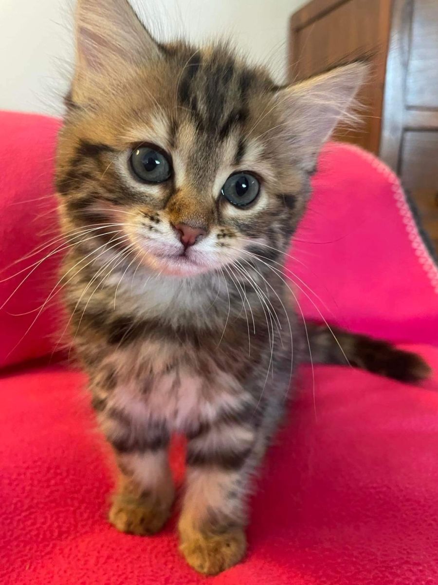 Lucy has a beautiful, gentle and loving nature, and simply loves cuddles. She loves to wrestle her brothers and is a typical playful kitten, but really just loves the company of other animals or humans. Lucy is comfortable with bigger cats; nothing seems to phase her at all. Little Lucy will make the perfect addition to any family, given younger children know boundaries and other animals would be introduced gradually.