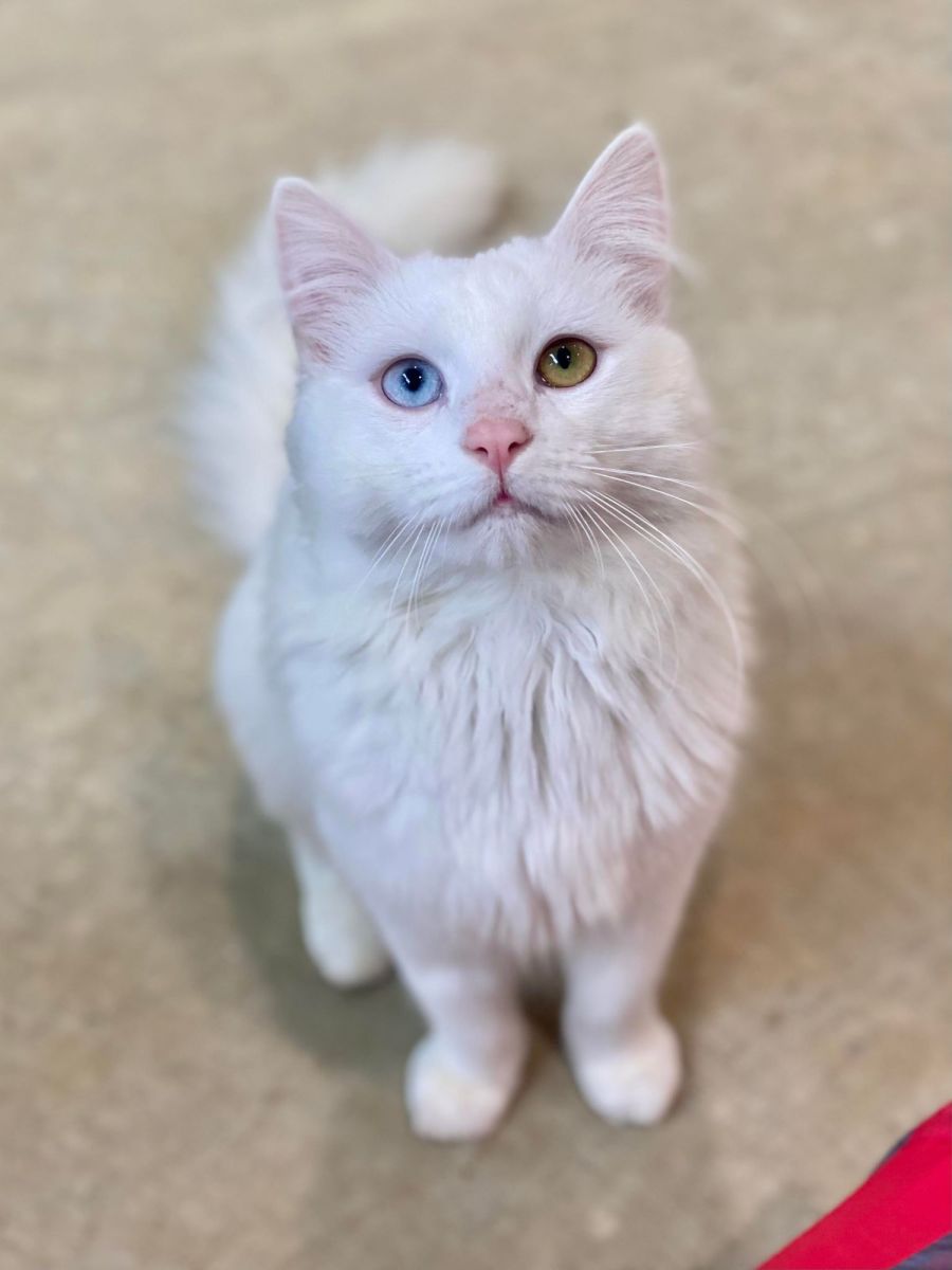 Due to his pretty pink ears and nose, he will need to be kept indoors to prevent the sun from damaging these sensitive areas. He seems to be fairly unbothered by other cats so may be okay to share his space with another feline friend.