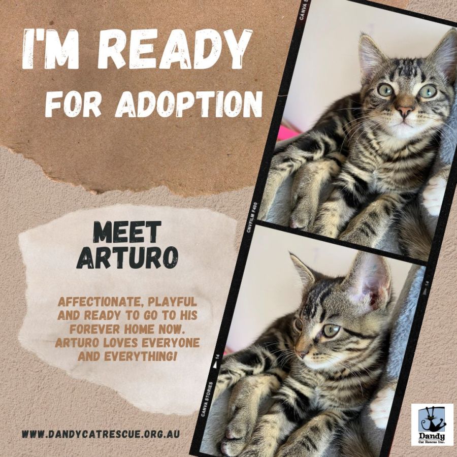 Fast-forward to today and Arturo is a whirlwind of beautiful tabby, tearing up and down the house. He is a happy boy who loves to run, jump and play with his siblings, with a person/people, young cats or a cat-friendly dog. His love literally knows no bounds.