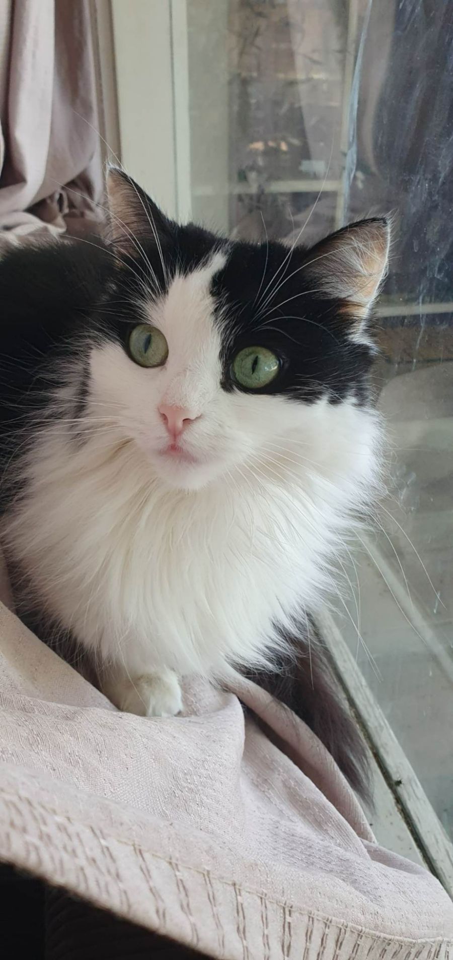 Moe moe is a 2 yr old long-haired black and white cat..