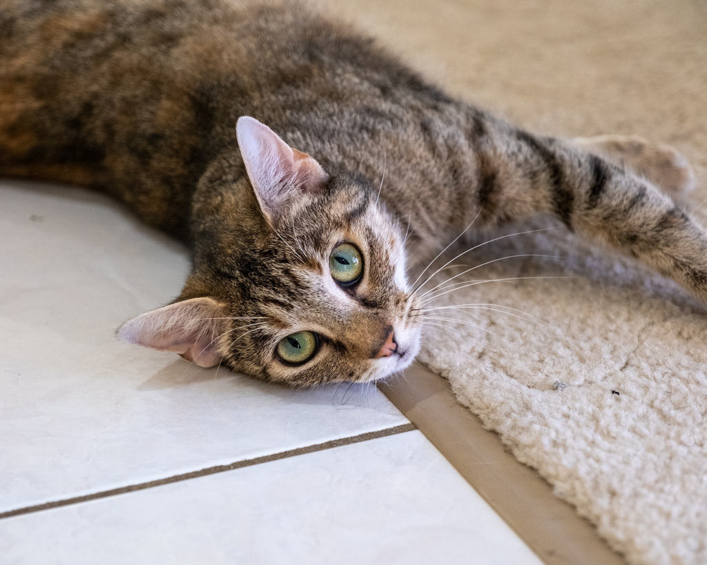 Miss Queenie isn't a big fan of being picked up and carried around, which is quite common with adult cats, but loves to sit near and beside her humans for love and affection. She has developed a particular favourite chair in her foster home, right beside the window so she can watch the world go by and maybe soak up some warm rays. She is also a big fan of a good old roll around and lounging about on the carpeted floors, they're very warm and soft!