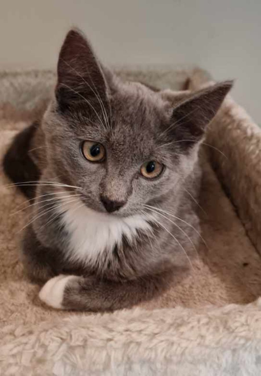 Asha is a female blue grey and white female kitten with a date of birth 01/08/2022.