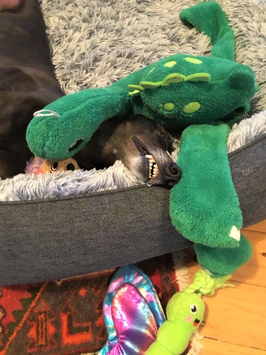 Her Favorite position is on her back with her tongue hanging out. She loves pats and cuddles and collecting and playing with her toys. She also loves the car and has no problem jumping in and out. As she settles into her forever home her quirky habits will emerge. Whoever adopts Lilly will be a lucky person.