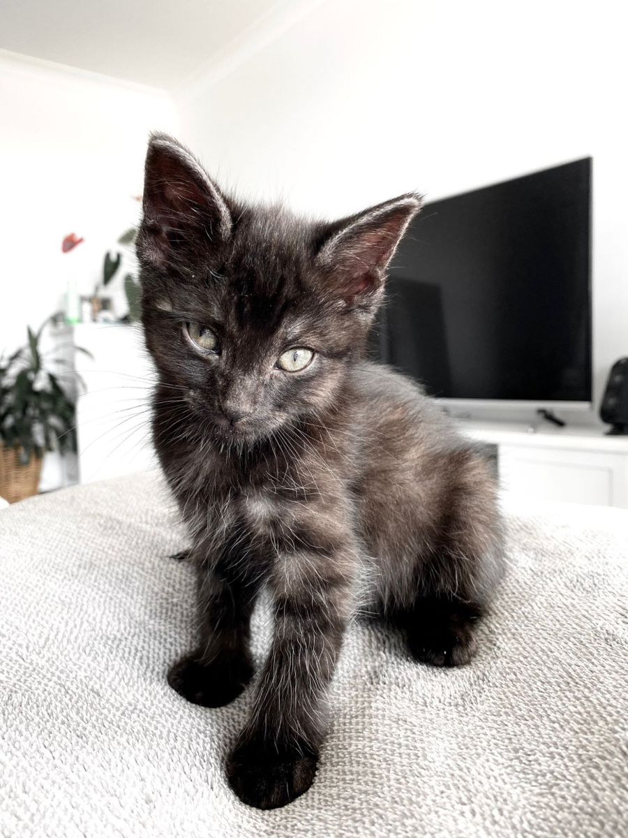 Hi I'm Howl! I'm a solo kitten so I'm very in need of a loving family to give me all the attention in the world. I am zoomy, playful, cuddly, and absolutely bursting with purrs. I will fall asleep on your shoulder if you leave me there long enough (I could have been born a parrot).