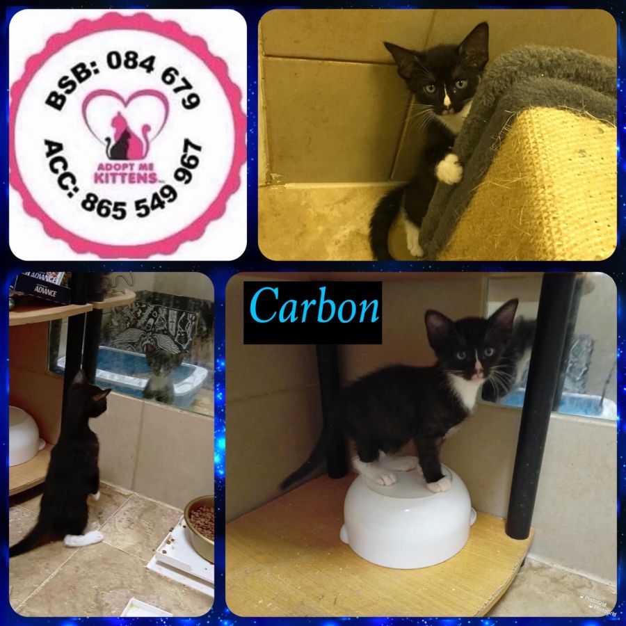 Carbon has such a striking nose blaze. He is inquisitive and super cute. He loves to play with his siblings, running and jumping and climbing. He loves playing with wiggly toys and jumping around over feet. He is inquisitive, and also likes to hide behind objects only to pounce out at u walking by. A gorgeous kitten that is looking for his furrever home.