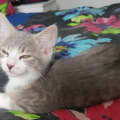 This adorable little grey and white kitten (with super cute flecks of light ginger) came to us with his three siblings when they were just weeks old.
