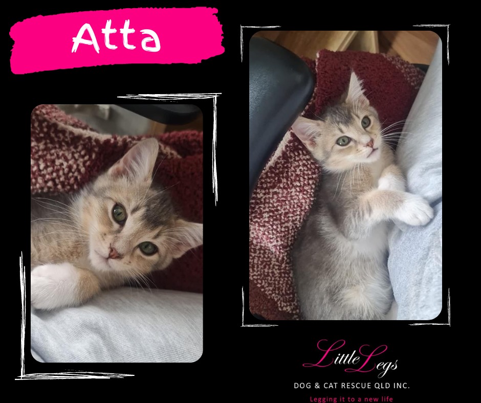 Ok so, my name is Atta, like in princess Atta from the Bugs Life movie. And, well, that's because at first, we all thought I was a girl!! Until a very recent vet visit told us otherwise, so the name has well and truly stuck. So, Prince Atta it is. I am adorable and cute and a little bit cheeky and crazy. I love running around and playing with my brothers and sister. I would love to go home with one of them so I can keep playing with them. I get lonely sometimes, so I yell out to my foster mummy for reassurance she's still around!! And then she comes and gives me a big hug. Which I love. I hope to find someone to give me lots of cuddles and kisses.