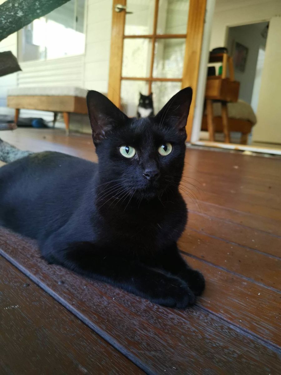 Cleo is a black, short haired female. She has been a young mum and has looked after her babies beautifully getting them to safety. Cleo likes to sleep on beds and is a very lively girl that can out play the kittens.