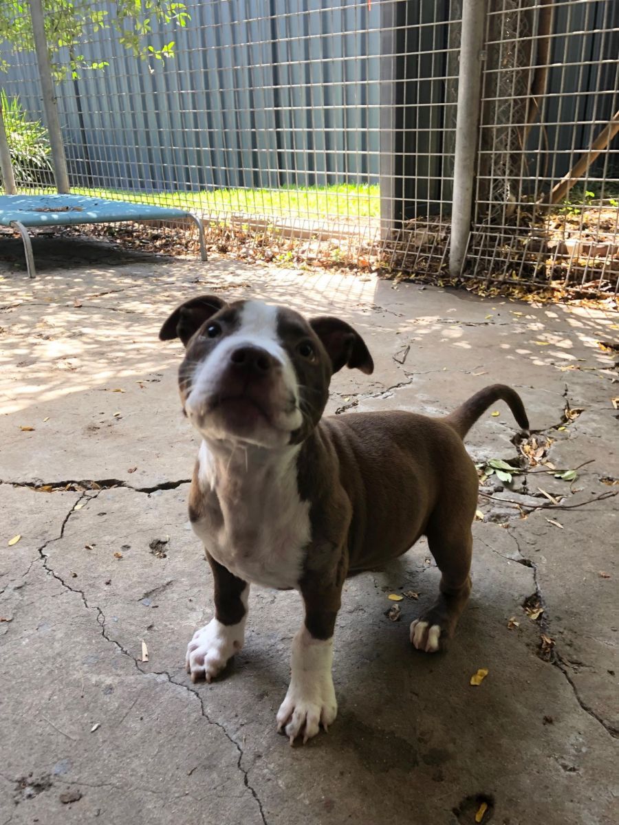 Angelina (along with her brother Brad) came to us after they had been involved in a fight with another dog. Angelina is a very outgoing and inquisitive puppy who is loves to be around people