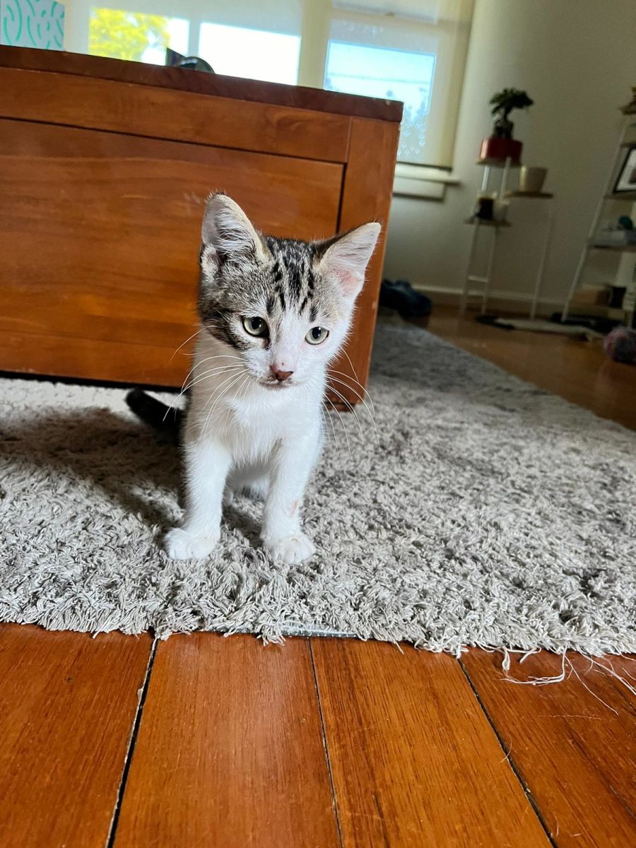 I’m not quite sure who I am yet and I’m still learning how to be a cat but that just means I’m like a blank canvas ready to teach. Although quite shy at first, I love attention and snuggling once we get to know each other. I also love hanging out with other cats if you have them! I’m not fussy with my food and I love to purr.