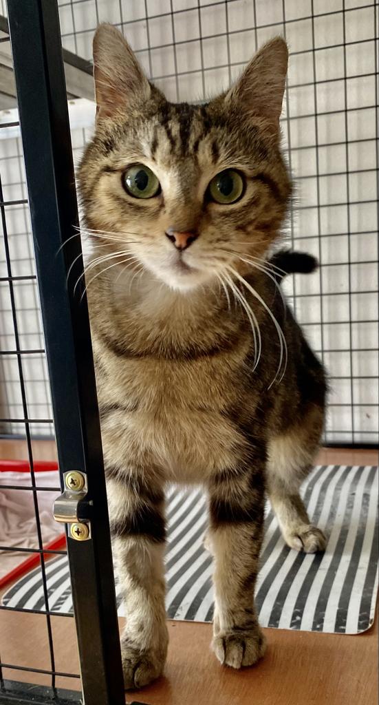 Look at that face! Billie Kat is approximately 7 months old and is a domestic shorthaired cat with a light brown semi-marbled tabby coat. Affectionate, inquisitive, quiet and sweet natured, Billie likes food, cuddles, pats, playtime and sleeping on the bed with her humans... and feeling safe! She dislikes strangers, vacuum cleaners and loud noises and will hide herself away until she feels it's safe to come out again.