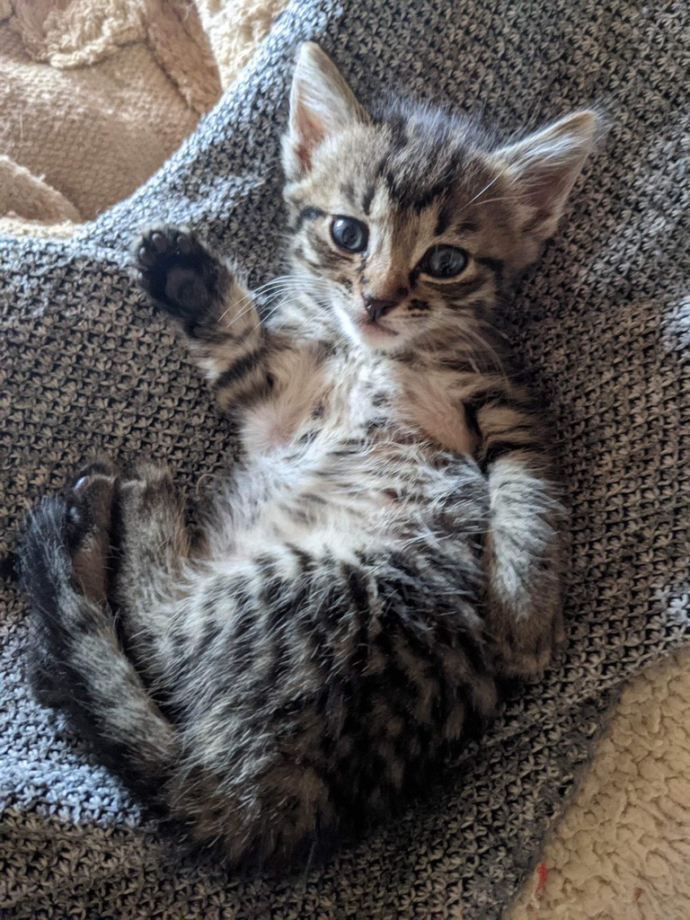 Little Miss Turkey, affectionately called "" Little Turks"" is a lovely 8 week old tabby kitten, found at the wrong place for a little kitten - at a mine site.