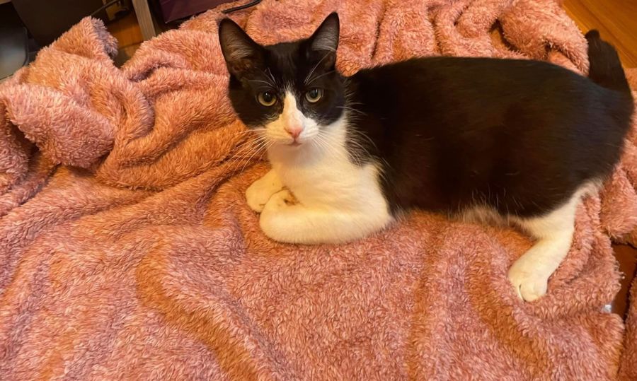 I’m a talkative black and white who gets along with cats and friendly dogs!
