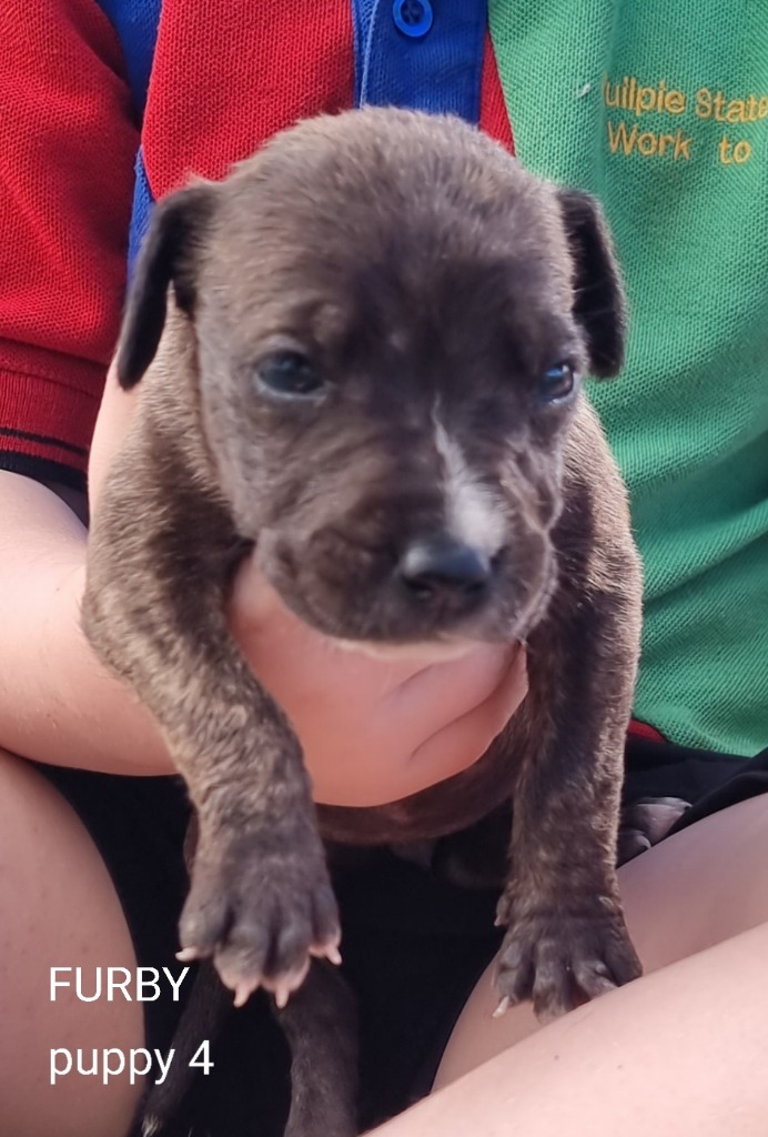 I'm one of a litter of very cute staffy crosses. My mother is super chill and tolerant of children, and I've had young children picking me up and enjoying my company all my life. Mum is on the small side of medium, Dad was taller. You can see photos of them with my photos. We've had one vaccination already, we'll get another (included), we're wormed, flea treated, and we'll be desexed at 6 months old. If you like your dogs medium to large please consider giving me a loving home.-