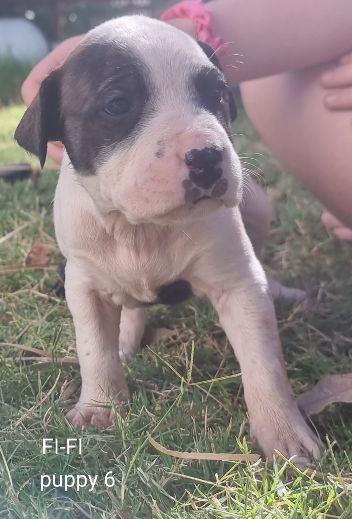 I'm one of a litter of very cute staffy crosses. My mother is super chill and tolerant of children, and I've had young children picking me up and enjoying my company all my life. Mum is on the small side of medium, Dad was taller. You can see photos of them with my photos. We've had one vaccination already, we'll get another (included), we're wormed, flea treated, and we'll be desexed at 6 months old. If you like your dogs medium to large please consider giving me a loving home.-