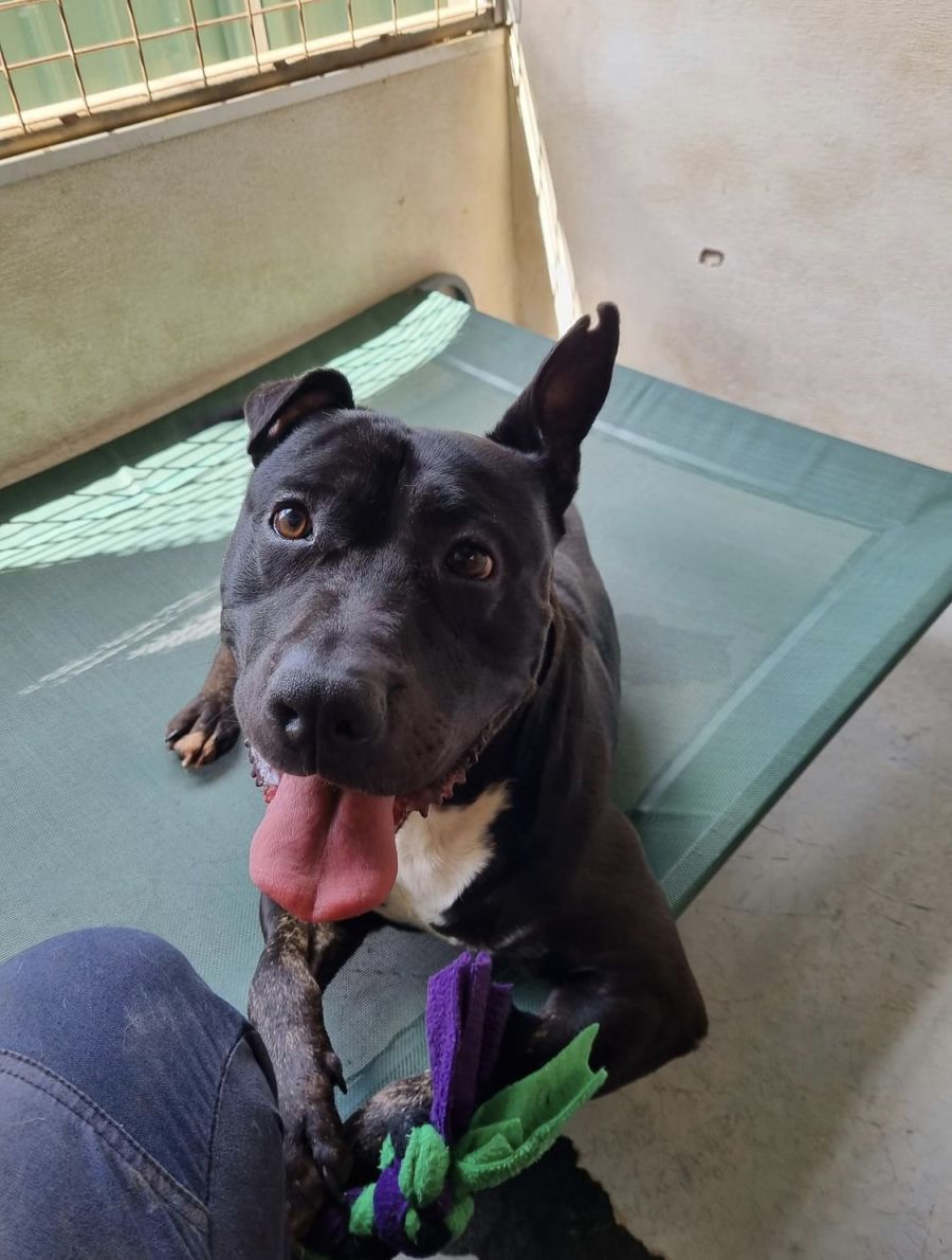LJ is a 4-6yr old staffy x kelpie mix who can be found in our very first kennel at the facility. LJ inside the kennel is a very well behaved boy and when you walk past he will seldom be barking at you unlike some of the other dogs. He is a big goof ball and smooch who enjoys chin scratches and ear massages and sleeping in funny positions. Outside of the kennel however LJ can be quite excitable and as a strong dog he will need an experienced handler. He has gotten along well with other dogs at the facility but can be a bit dominant. He does however listen when you tell him to stop. He would therefore benefit from a little bit of training to assist with his socialisation and excitement. If you have a dog at home and you would like to meet LJ please bring them along for their meet and greet.