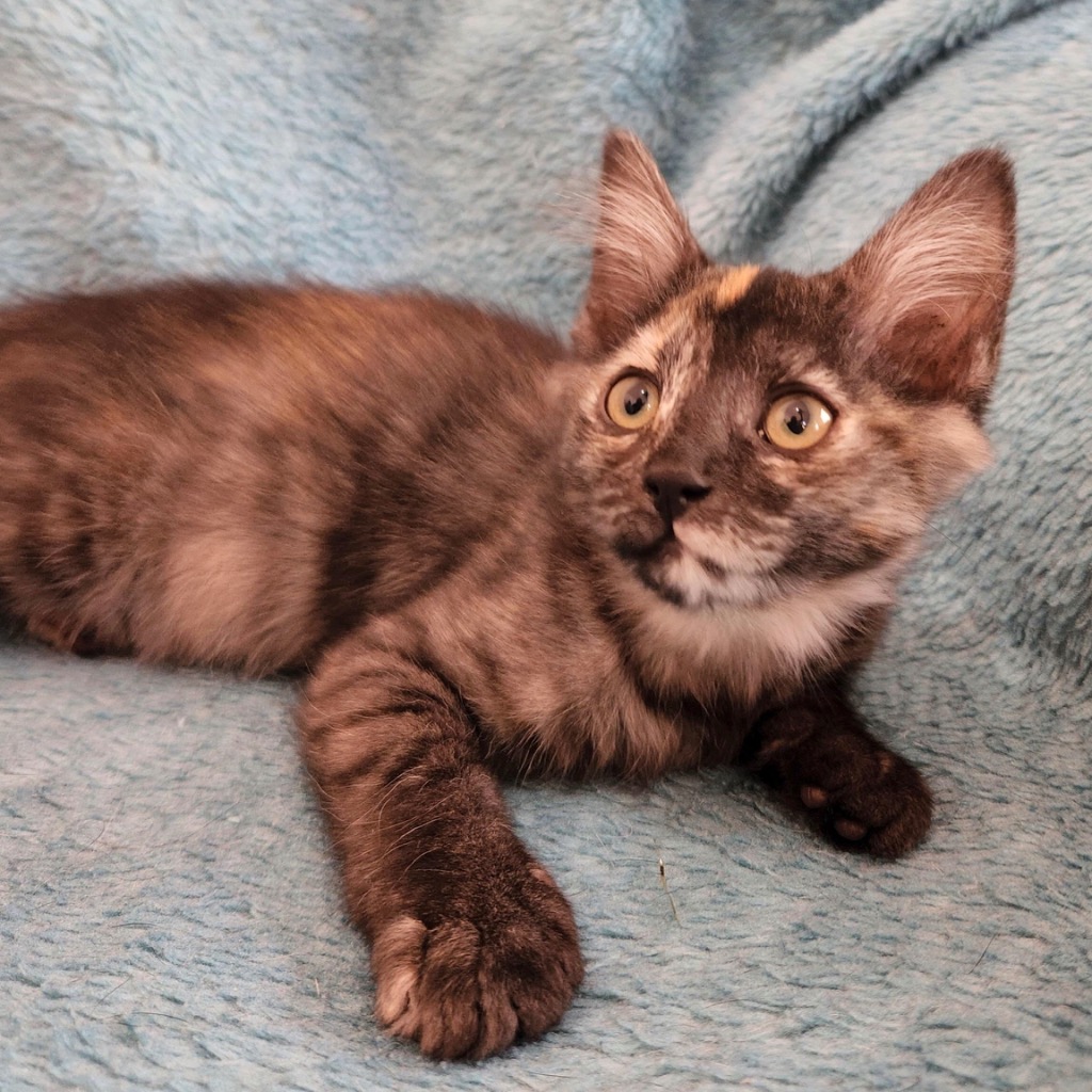 Say Hi to Smokey! She is an adorable little girl who is extremely social and absolutely loves humans. She will do anything for a close up snuggle. She has met young children and is super happy to be patted and cuddled by them, as long as they are gentle. Smokey adores her foster sisters and after a good session of chasey and wrestling, she cuddles up with them for a cosy nap. She's not fussy at all and will eat any kitten food with gusto. She will always let you know, with her cute little chirps, if you're taking too long to serve her! Smokey has met the small resident dogs and wasn't too worried about them. With slow introductions, she could become great mates with other dogs and cats.