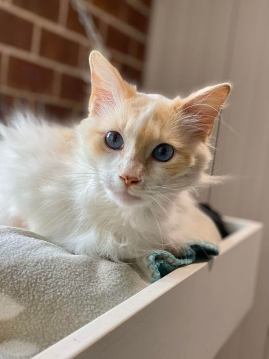 Due to his light colouring, Brandy would be better suited to being an indoor-only cat to protect his ears and nose from sun damage.