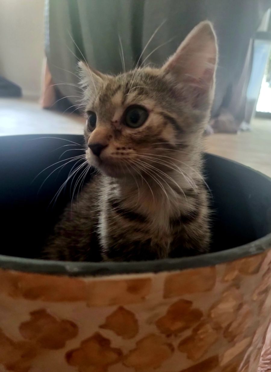 This beautiful little girl is only tiny , but has a very big bright personality . Shes very purry She is curious about the world around her and loves people she interacts with other cats very gently also .