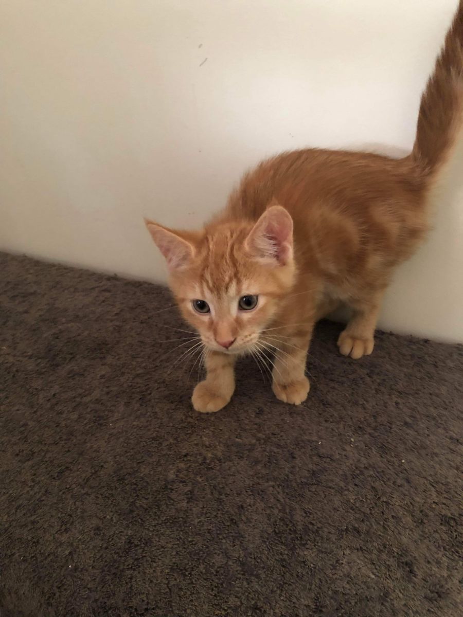 Riggs is the bravest and most curious of the 3 siblings that are left. He is the first one at the door to greet his carer whenever she comes into the room. He licks feet and hangs off the bottom of your trousers. He is a typical kitten and loves to play with toys. He was the first to give cuddles and now purrs like an expensive engines. This ginger baby will steal your heart. Currently at Darra, he is waiting for his perfect home.