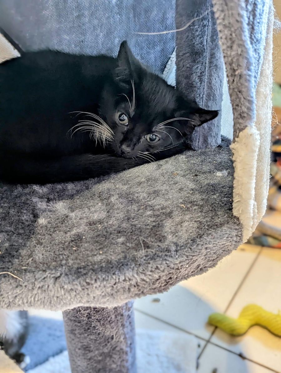 Kuro loves to sit back and watch her siblings cat wrestle before she picks the right time to jump in and play. She enjoys the quiet and often finds a calm , comfy spot under the bed or in the cat tower to sleep the day away in between eating, playing and eating some more.
