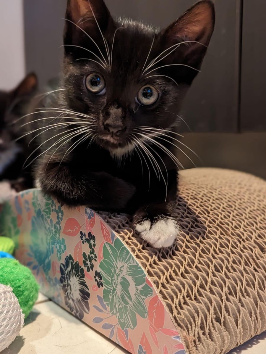 Noir enjoys cuddles and snuggles with her people! She is a purr machine who loves to snuggle with you and will purr when she is relaxed and in a comfy spot in your arms.