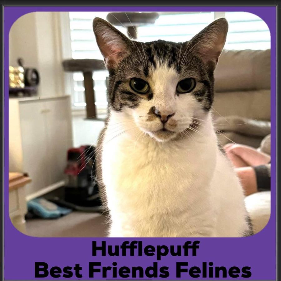 Hufflepuff is a curious little girl who loves to sit back and watch what’s going on before joining in the fun. She likes finding a snuggly place to sleep and curl up happy and content. She loves playing with her brother and sisters and happily runs up and down the hallways with them. Hufflepuff loves the coziest spot on the cat tree to curl up to have a nap. She also adores boxes to jump in and play hide and seek. Hufflepuff and her foster sisters love following their carers around and explore the house and play with a shoelaces.
