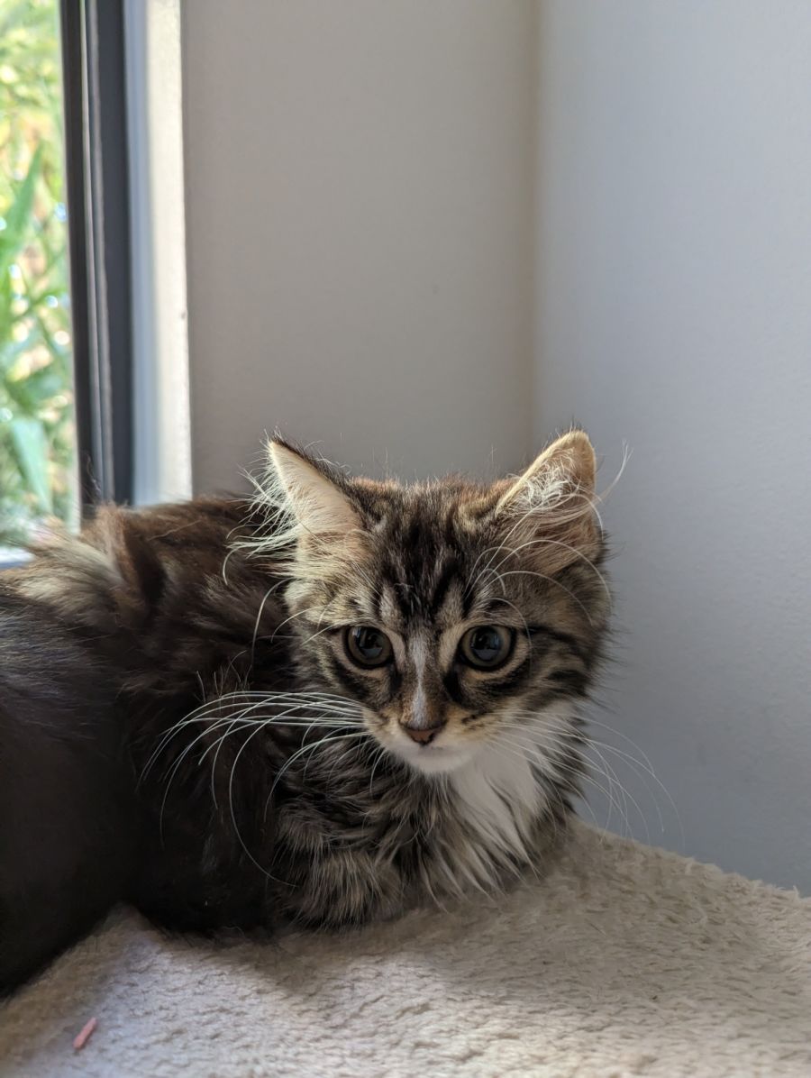 He is a shy little kitten who loves to nap and receive butt scratches. He gets along well with her foster siblings and will often nap alongside his siblings. Although he is still learning to trust humans completely, he's making very rapid progress and he simply can't resist but scratches and will plop over to expose he belly quite quickly.