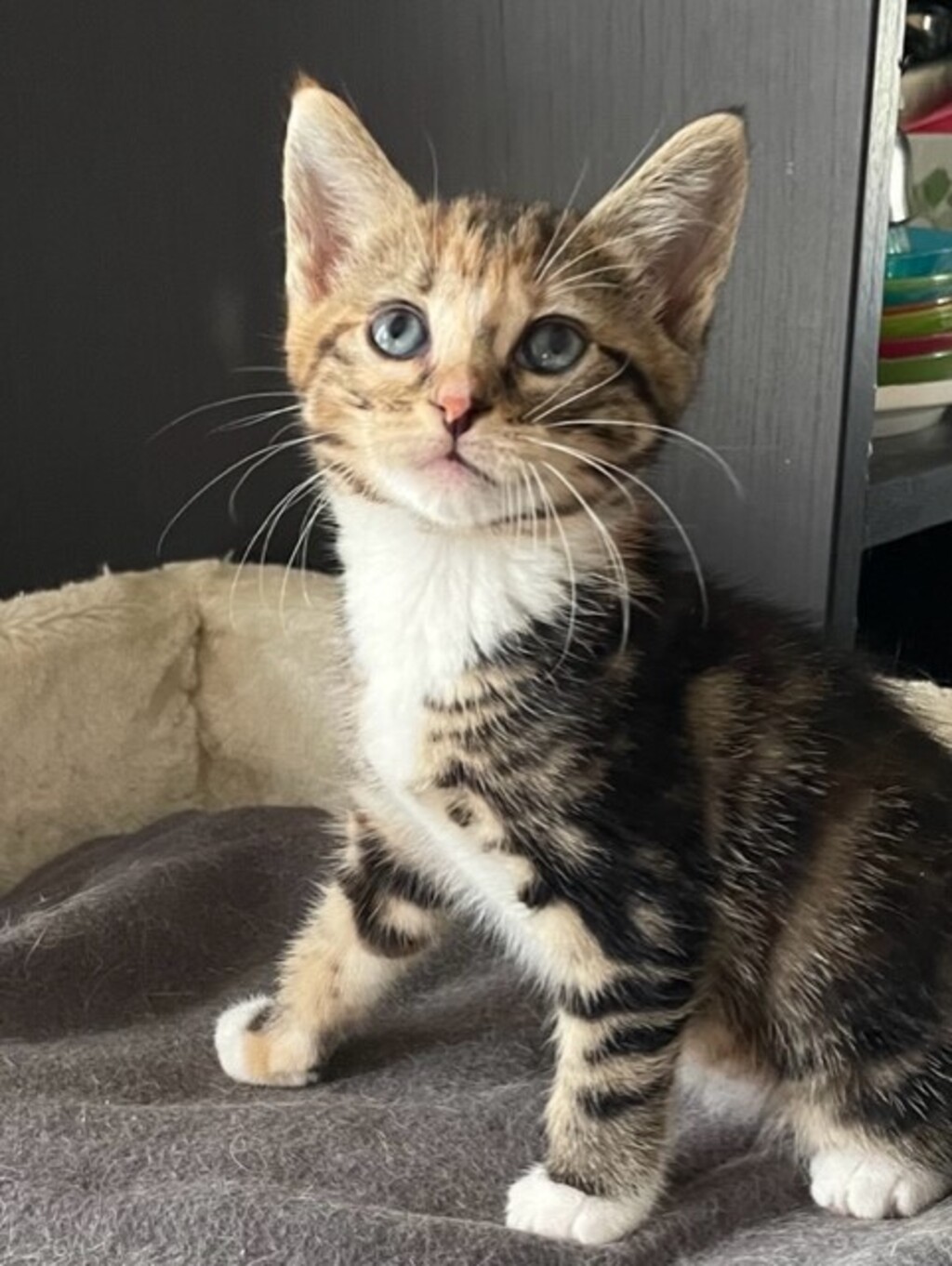 Jingles is the prettiest dark tabby and white girl. She loves to have a cuddle and purrs loudly when she is picked up. She is in foster care with her sisters Holly and Tinsel. She is a lovely kitten who would love her furever home. Jingles will come desexed, vaccinated, microchipped, flea and worm treated.