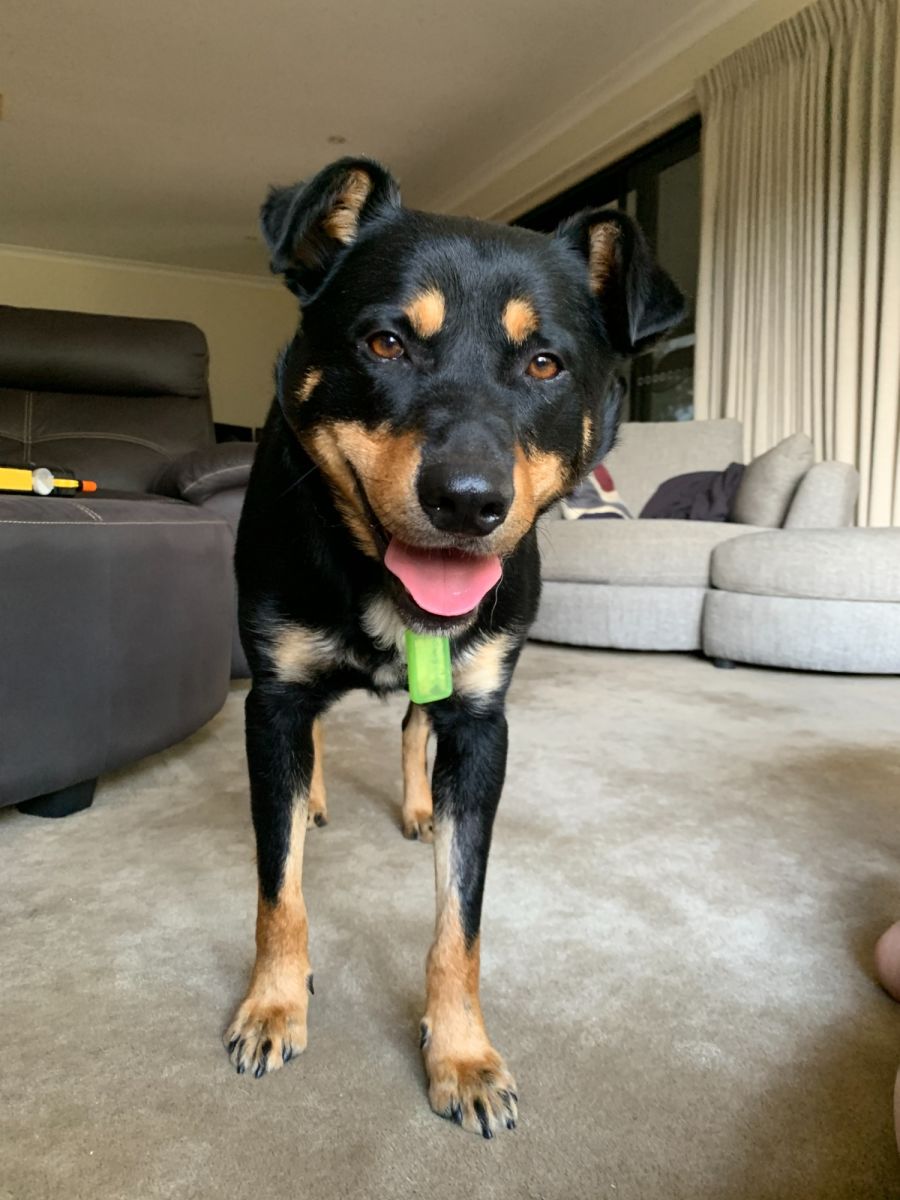 I am a little slow to warm to new people, but once I am comfortable I love pats and head rubs! I enjoy playing by myself with my toys and zooming around, but oh boy it’s even more fun when I have a doggy friend to play with! Foster mum says I am a big (24kgs) goofball when I am having a mad bouncy moment!