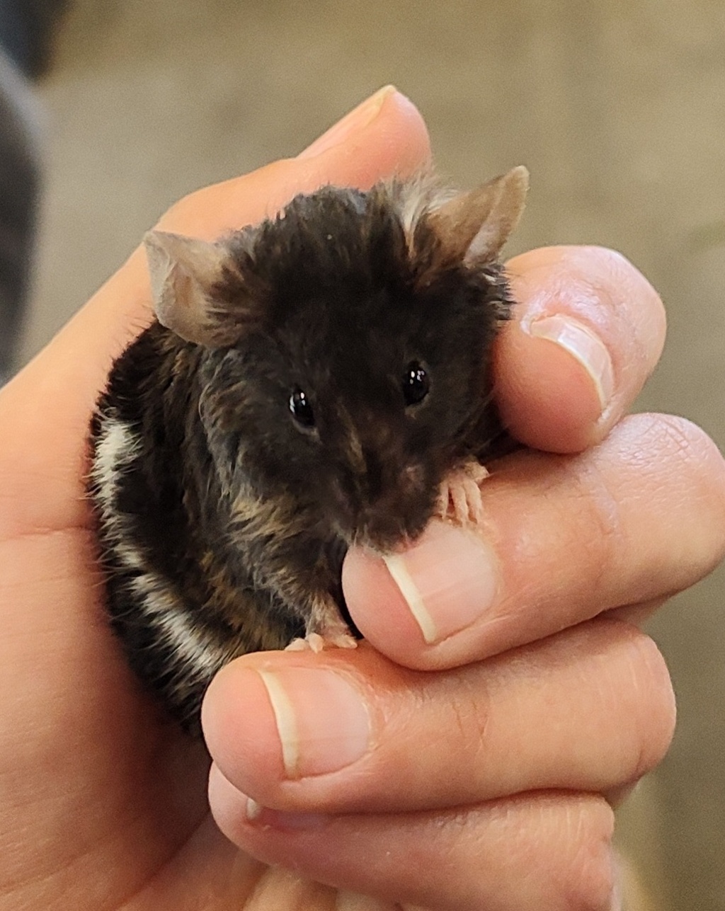 This is Veronica. As you can see, veronica has beautiful shiny eyes and enjoys using her play wheel. Veronica has a sister Gabriella and they will need an indoor mouse enclosure with plenty of enrichment to keep them busy, and some hidey holes so that they can feel safe. If you're looking for some cute little additions to your home, apply to adopt them today!