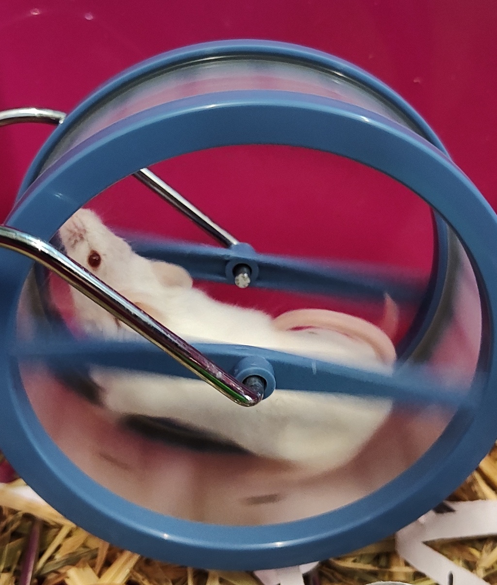 This is Gabriella. As you can see, Gabriella has a beautiful shiny coat and enjoys using her play wheel. Gabriella has a sister Veronica and they will need an indoor mouse enclosure with plenty of enrichment to keep them busy, and some hidey holes so that they can feel safe. If you're looking for some cute little additions to your home, apply to adopt them today!