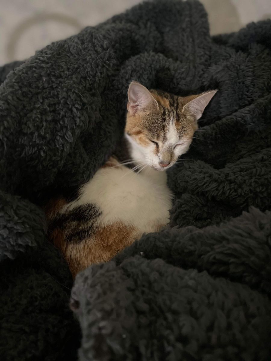 Delilah came to us from the pound, very unwell and heavily pregnant. On the car-ride over to her foster home, she gave birth to three kittens in the back seat of the car, and two more on arrival. Sadly, Delilah was so incredibly unwell that three of her babies were stillborn, and she was unable to care for the other two. We thought she wasn't going to make it herself.