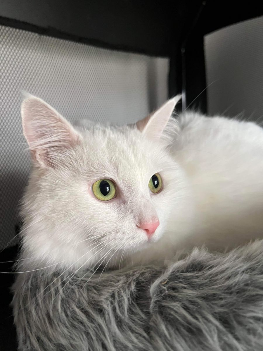He is 2 and a half years old, and would be great in a house with other cats,dogs and/or children. If you hadn’t noticed, he has big beautiful green eyes and a fluffy white coat (his little pink ears and nose can burn easily, so he needs limited sun baking time even though he loves it).