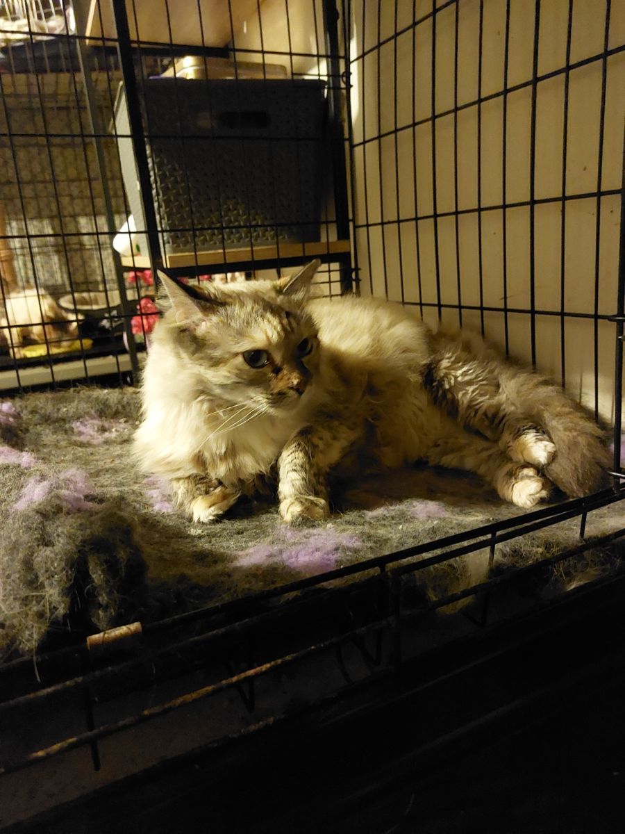 She was rehomed about 4 years ago and has found herself back in care a few months ago due to her owner passing away. she wasn't too happy about that, but she's come good now she's quite friendly and happy she doesn't need to be in the cage that she's in or the enclosure , but she's happy in there, the door is always open and she does come out and sit on the back of the lounge at times because she feels nice and cosy and safe in there. Missy has the most gorgeous ice blue eyes you can't really see it from the pic she s listed as a long hair smoke point torti, she does enjoy a Pat and I'm sure that in the right situation she'd be the most loving cat, her previous owner has passed away as I said The family although they couldn't keep her and take them with her interstate you can tell she was a really loved cat where she was. To find out a bit more about missy or to meet her please text missy to this number 040661239 include your location and a little bit about yourself....she's very good with otger cats around her and she doesn't seem to be worried about dogs she will let you Pat her but on her terms but as I said she is getting better and better every day and much more comfortable it's a big upheaval for these poor animals when they moved and my hope to find her another loving home asap