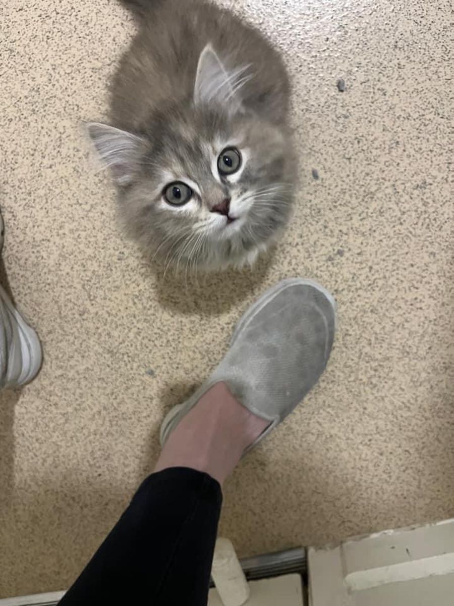 Penelope is a ball of grey energy. She is never still whether it’s chasing the dogs, or her sister. She loves to climb up legs to get your attention if you ignore her or if you have bare feet, she will play with your toes.